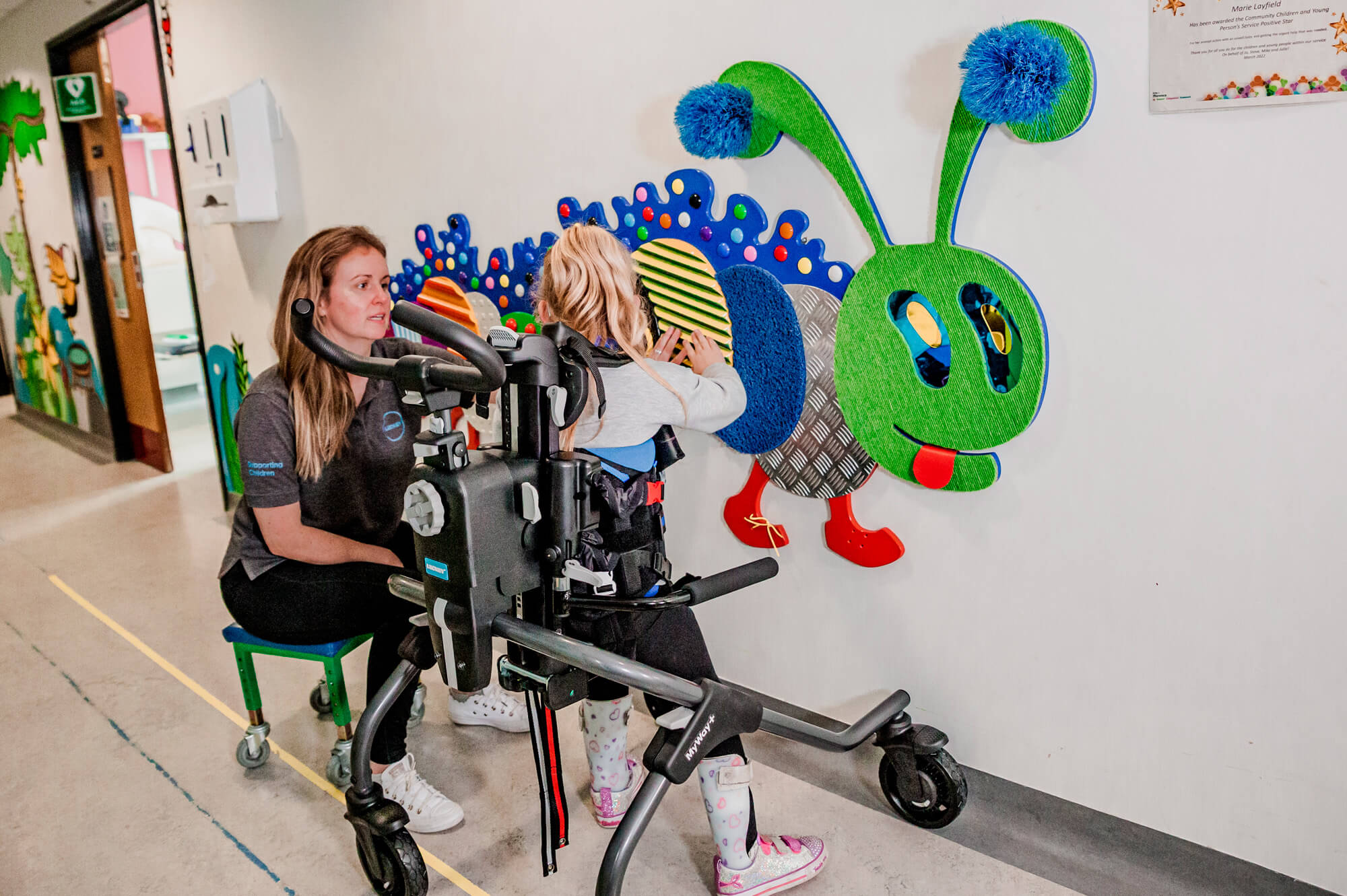 Nastavení úhlu náklonu bez použití nářadí a hrubé a jemné nastavení výšky spolu s širokou škálou příslušenství zajišťují, že terapeuti mohou optimalizovat nastavení tak, aby maximalizovali zapojení dítěte do hry.